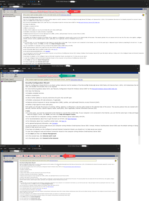 Btw,RDM's default RDP engine (RDP (Latest) with 100% zoom is too small to me when I use win11 with 4K resolution and high DPI connect to win2003,and Zoom with 125%,150% the text is blurry.So I have to use RDM with FreeRDP.